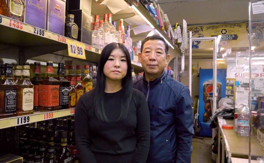 So Yun Um and her dad, Hae Sup Um at their liquor store. (Jacki Huntington)